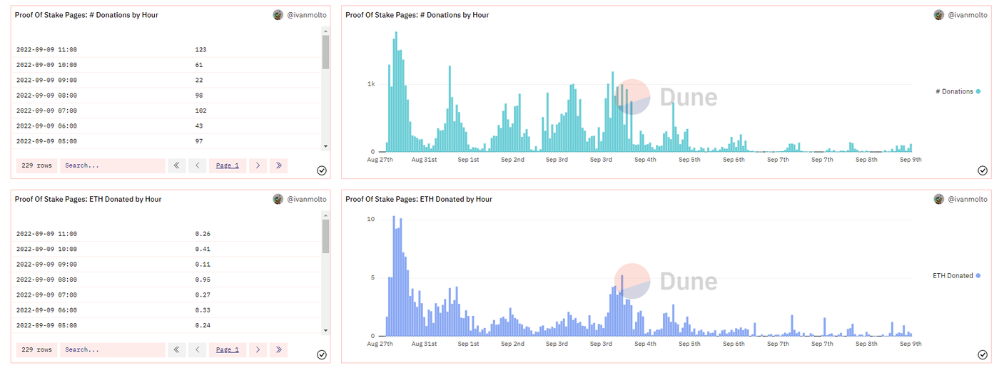 在網址 https://dune.com/browse/dashboards 的左上角就是搜尋欄,隨便找一個自己喜歡的議題。一開始不如簡簡單單,就找一個時下新話題:V 神的 Proof of Stake 新書,只要捐款給 GitCoin 就會送一本電子書及一個「靈魂綁定 NFT」。如果有看《以太奇襲》都知道 V 神寫比特幣稿件起家,十多年文章結集成書就算沒有 NFT 本身都經已夠有看頭啦。在 Dune Analytics 搜尋可以看到經已有幾個儀錶板,而其中 @ivanmolto 心心數字最高,就點入去看看吧。