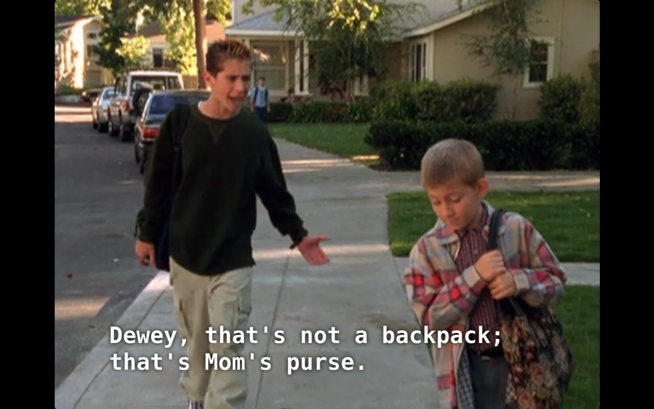 另外还有一集在第二季是关于dewey的。dewey喜欢上了妈妈的手提包后每天背去上学。被reese看到后勒令他换回正常的书包因为他这样肯定会被其他同学欺负。dewey拒绝背普通书包,还是继续用妈妈的包包去上学。reese在这集里用尽了各种方式诱导弟弟换书包最后还是失败。在他就打算在旁边看dewey被同学欺负的时候,dewey自己在妈妈的包包里偷偷装了砖块,狠狠的砸了欺负他的几个胖仔