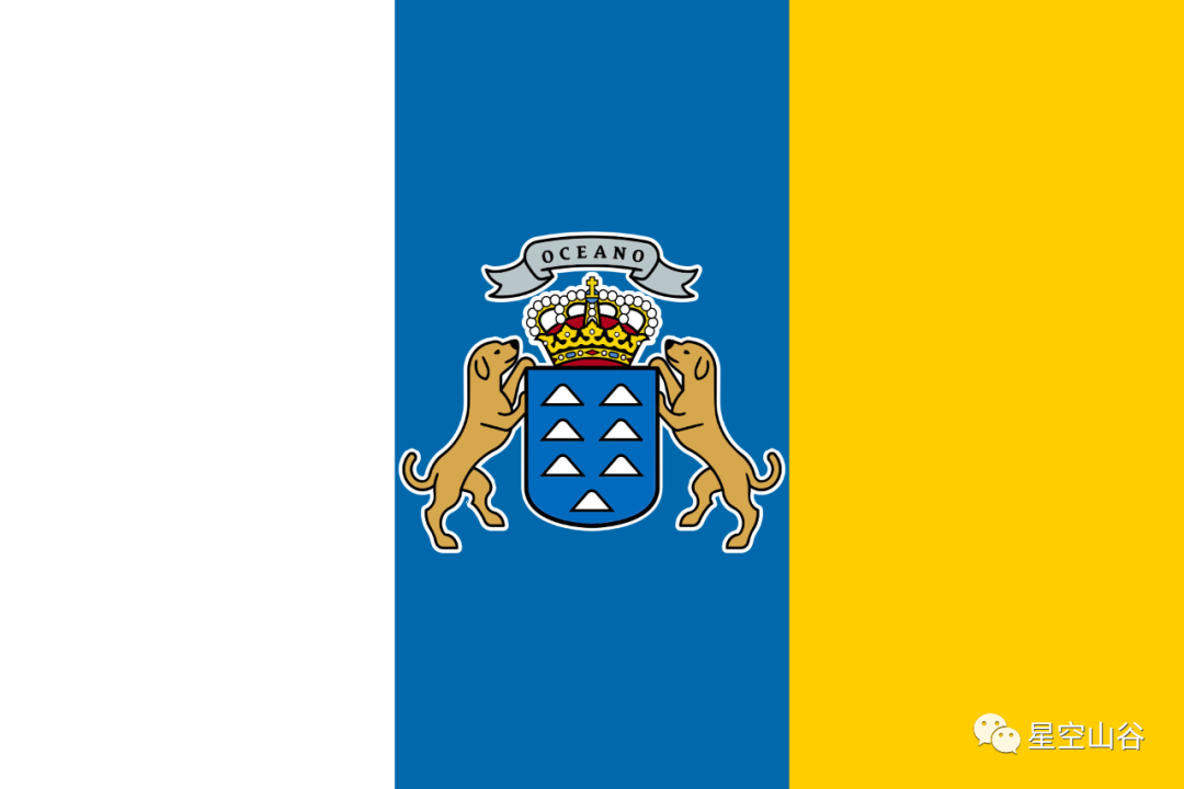 加那利群岛的名字可以追溯到公元前50年(汉元帝时期)。毛里塔尼亚国王-尤巴二世(罗马战神安东尼与埃及艳后的女婿),因为这个岛上有众多“体型庞大的狗”便用拉丁语“Canariae Insulae”为其命名,意思是“多狗的岛屿”。这是他们现在的“岛旗”,可爱不?