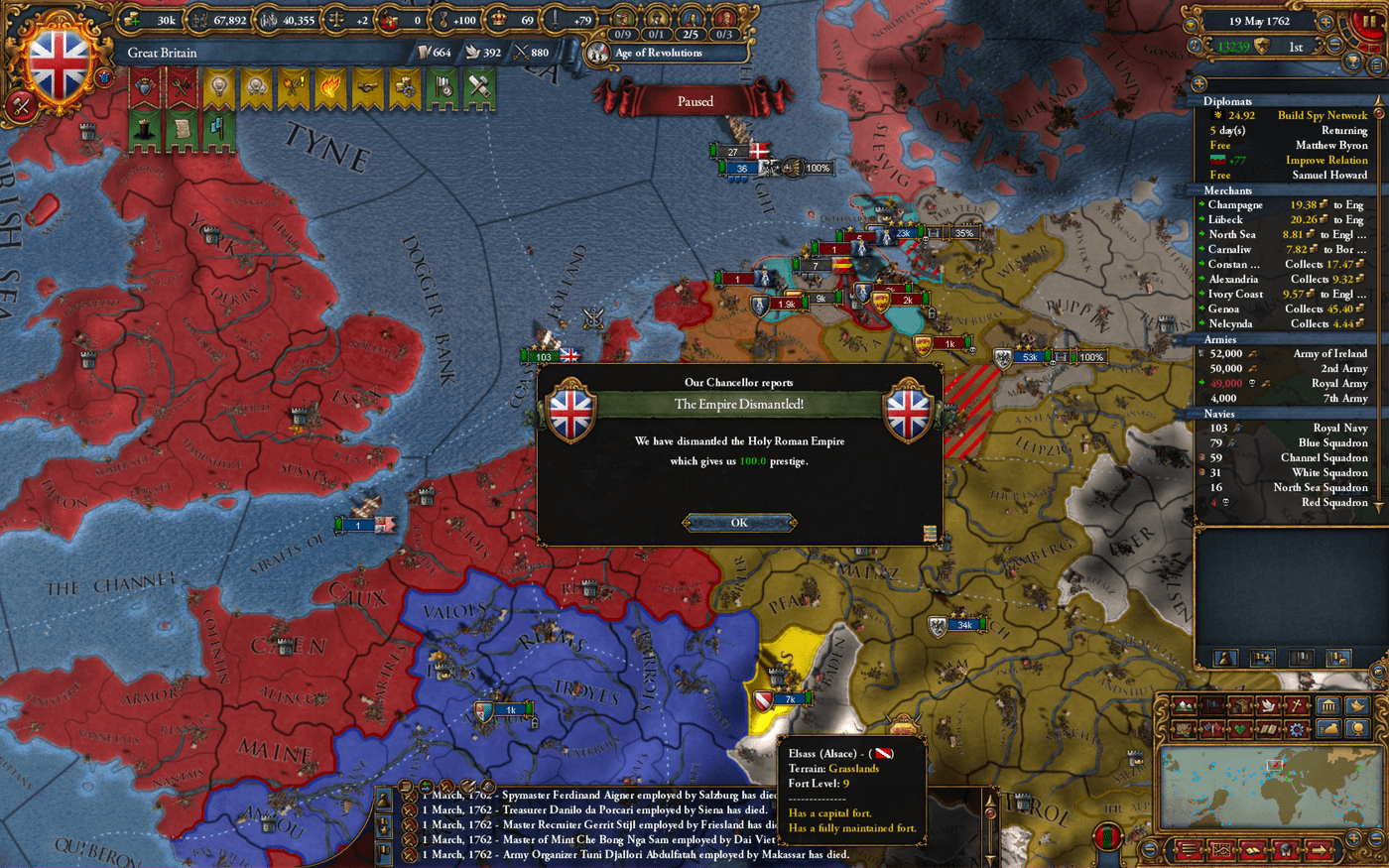 到1762年,神罗被我灭到剩下8个诸侯,选帝侯3个(阿尔萨斯、布伦瑞克、布拉班特),布拉班特是皇帝,阿尔萨斯是我的附庸。带着阿尔萨斯宣战布伦瑞克,布拉班特作为皇帝参战,这样神罗所有的选帝侯都参战了,解散神罗的条件具备。皇帝首都八级堡,打不动,封锁海岸线之后,法国的50k攻城部队加3星攻城的将军从也要从-97%开始攻城。