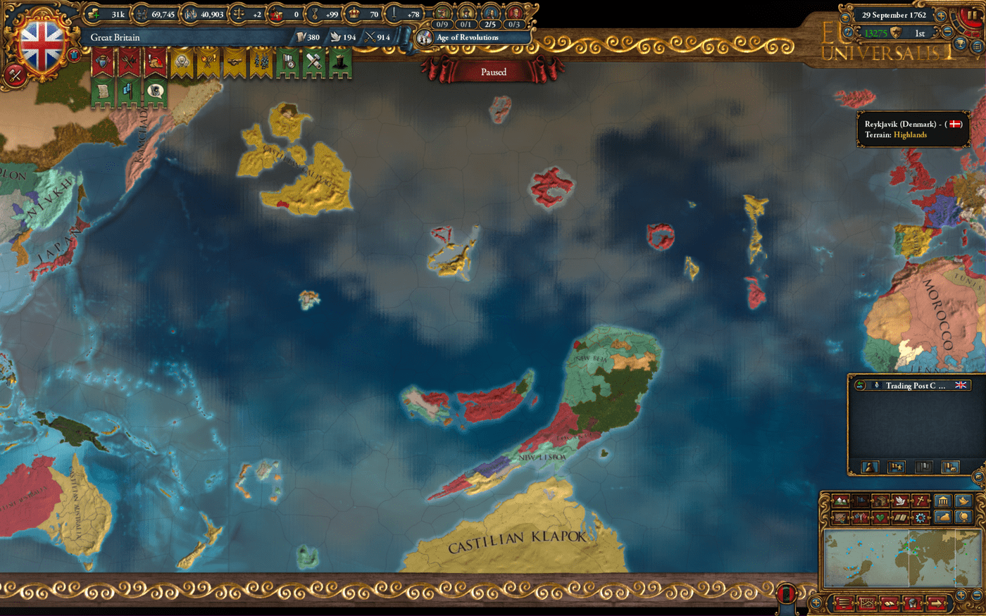 新大陆用了随机生成模式,不是真实世界的南北美洲。新世界地皮小而且散,幸好我走了欧洲大陆路线,没有依赖海外殖民,否则丢了法国,又找不到美洲,大英连卡斯蒂尔都不一定打得过,不要说解散神罗了。