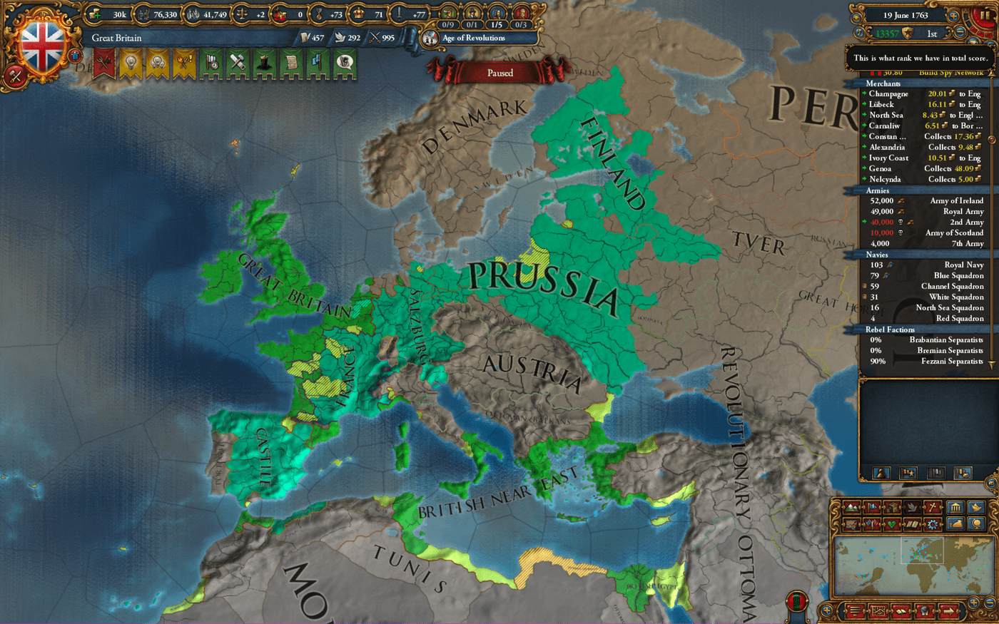 我方由英格兰组成大不列颠,君合统治法兰西、卡斯蒂尔、萨尔茨堡,附庸普鲁士、芬兰。