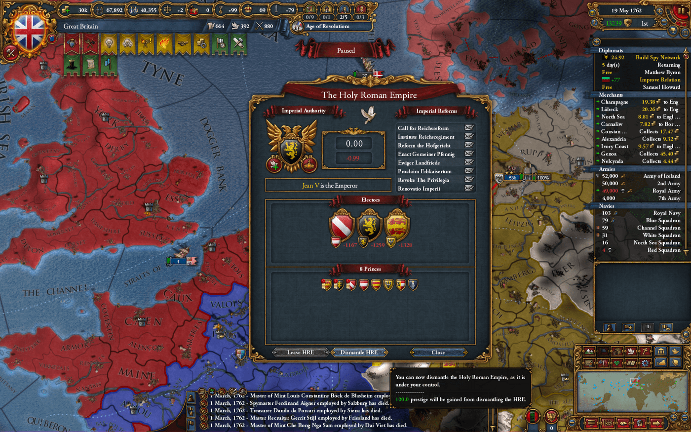 这个月断断续续打了一局EU4(Europa Universalis 4,「欧陆风云」,是个回合制战略游戏),1444年英格兰开局,以1821年前解散神圣罗马帝国为目标。