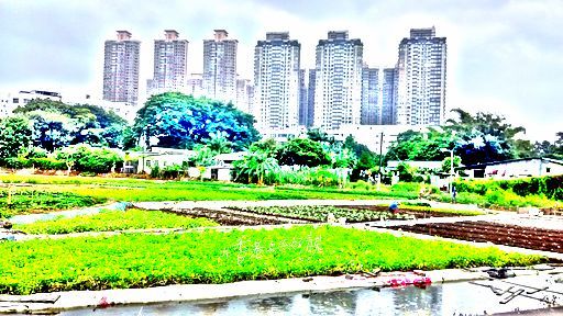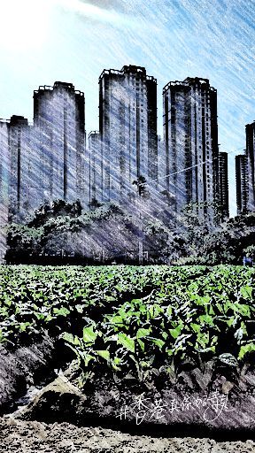但最吸引我的,反而是遊走在村中道路的風景: 路旁就是幾塊菜田,農人在彎腰耕種,遠方正是取代聯和墟巿的新建住宅大樓,如一道屏風般的橫亙在山野之間。