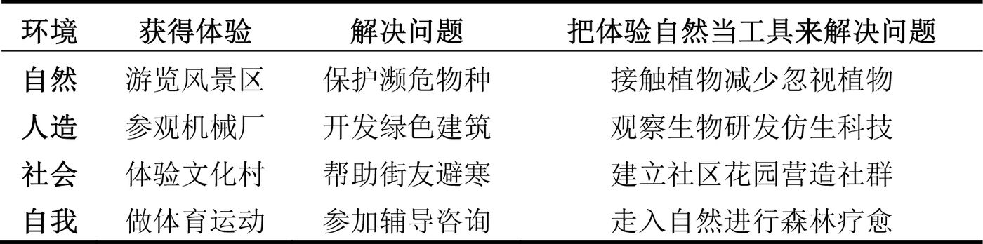 如果把自然教育與環境教育的關係畫在一張圖上,我們可以得到圖2的“葉片、水滴與香煙”模型(表1為圖2中各部分的方案舉例)。立足於四個方面的環境概念,環境教育希望能夠解決環境問題=保護環境=建立人與環境的積極關係。在這個目的下,環境教育方案分成更強調解決問題的方案與更強調獲得體驗的方案,形成了葉片的兩邊。在主軸是解決問題的方案中,一些方案會把體驗自然環境作為工具,即水滴部分。最後,香煙部分則是指那些強調獲得體驗、探索環境,但是破壞環境的方案。其中,環境教育的概念包含了葉片和水滴;自然教育的概念為圖中的①、②和③。