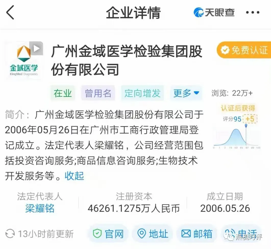 横当然有横的道理。据天眼查APP显示,金域医学法人代表为梁耀铭。主营医学检测,业务范围覆盖全国,号称是医疗检测界的“华为”。