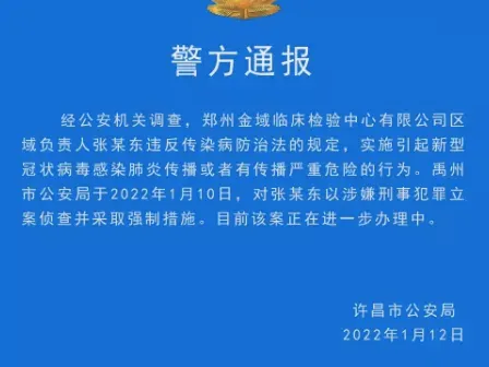 经公安机关调查,郑州金域临床检验中心有限公司区域负责人张某东违反传染病防治法的规定,实施引起新型冠状病毒感染肺炎传播或者有传播严重危险的行为。