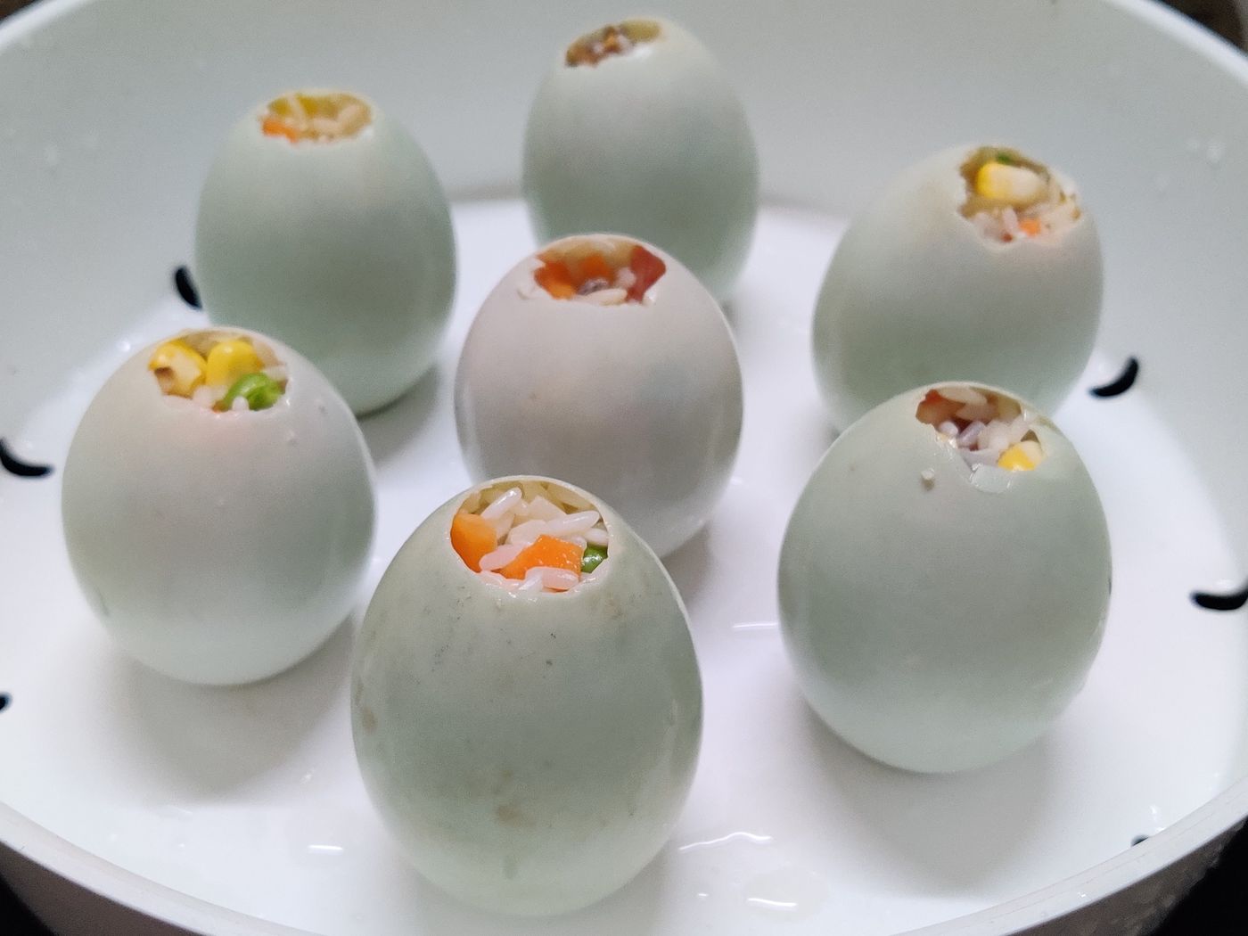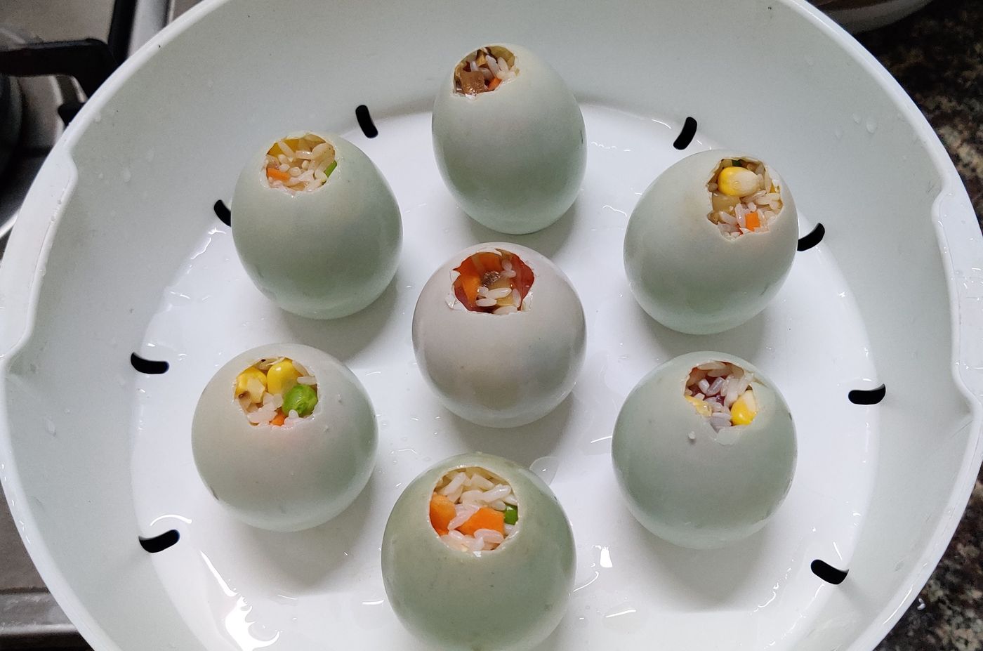 今天老婆又开始做好吃的了,这次做的是腊味糯米蛋。先在鸭蛋顶部开个小孔,将里面的蛋白倒出一些出来,然后就将事先调好味的腊味糯米装入蛋里面,里面材料有糯米,腊肠、红萝卜,玉米,碗豆,瑶柱。最后就是放锅里蒸60分钟就好了。