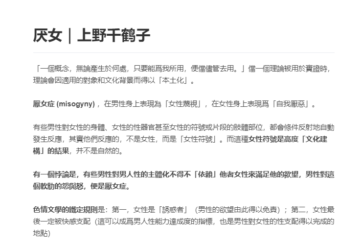 之所以會在這個事件之後第一時間去讀上野千鶴子的《厭女》,是因為長期以來我都對自己內心潛在的厭女情緒有所感知,這鮮明地表現在:覺得女生都很麻煩所以更喜歡和男生交朋友、曾經覺得穿著暴露的女性都是「不正經」的,以及在這次的鮑xx事件中下意識地想要指責受害者。