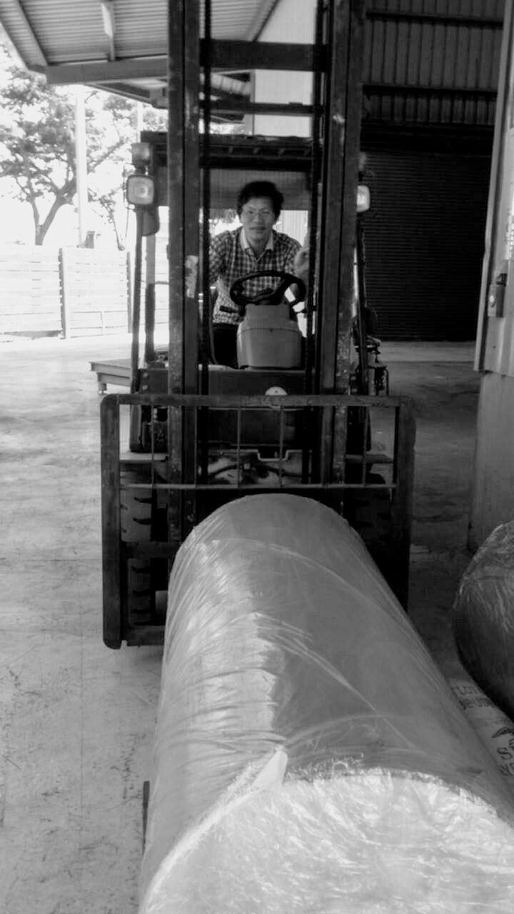 玩童平常要送的貨大約20-30公斤,這次突然來一支重達400公斤的,雖然玩童已經練得比以前「孔武有力」,但是看到這支布也只能搖頭,還好在出貨工廠,有外勞用堆高機幫忙送上貨車。