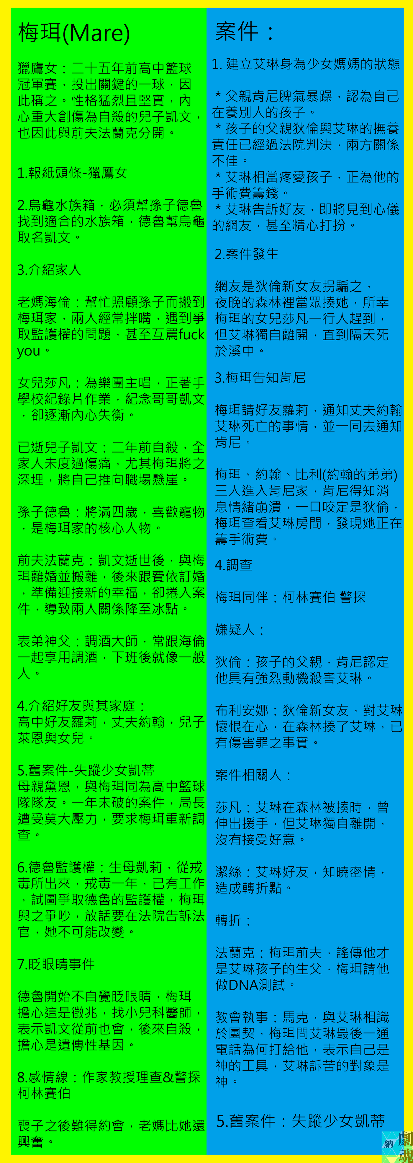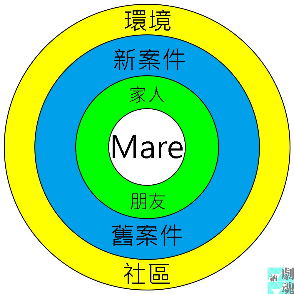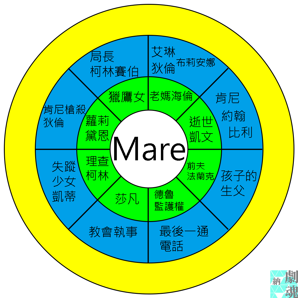編織順序可以依照場次分析進行,不過這樣對於讀者而言可能負擔太重,所以我用重點事件來說明,社區面向比較像是外殼,包覆梅爾與新舊案件。