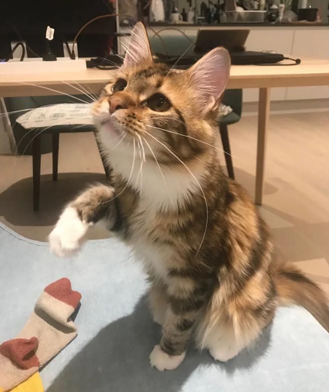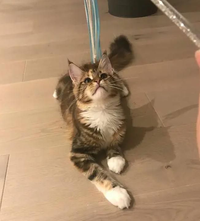 到家到现在只吃了40克左右,喝了很多水尿了很多次。今天肉眼可见的猫身上跳蚤屎少了很多,擦身上只有一些黑点点,拖地拖到了死跳蚤。 唉缅因真的是话痨,而且叫的和普通猫不一样。特别特别的好奇,对看不到的地方比如厨房台面就拼命扒拉叫的像个小狗还拖长音,想看我们在干啥,如果是猫玩具突然藏起来就会发出小鸟一样的咕噜噜非常的疑惑,想玩玩具就是嗷呜呜喵。一直要跟人走,呼噜震天响,必须睡人的脚底下。虽然很喜欢人,但是不给随便抱。晚上我们进卧室了会嚎会刨门,坚决不理。这个小屎球别想进我们卧室了。