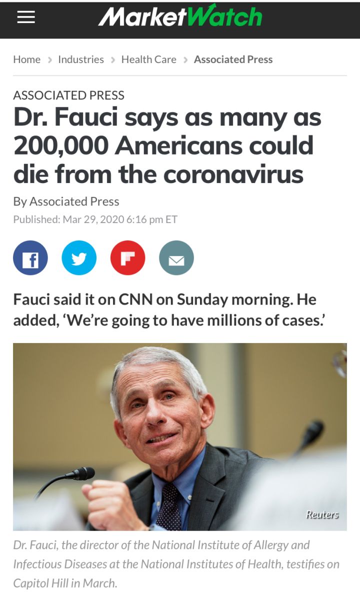 而不过三天时间,美国政府首席传染病专家福奇又说可能会有 10 到 20 万以内人死亡,而川建国表示那能控制在 10 万以内说明我们做的不错。