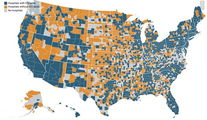 美国一半以上的县没有重症监护病床,这对超过 700 万的 60 岁及以上老年人群构成了加大的威胁,Kaiser 健康新闻数据分析显示黄色区域都是缺少 ICU 床位的,灰色无医院,蓝色是 ICU 床位。