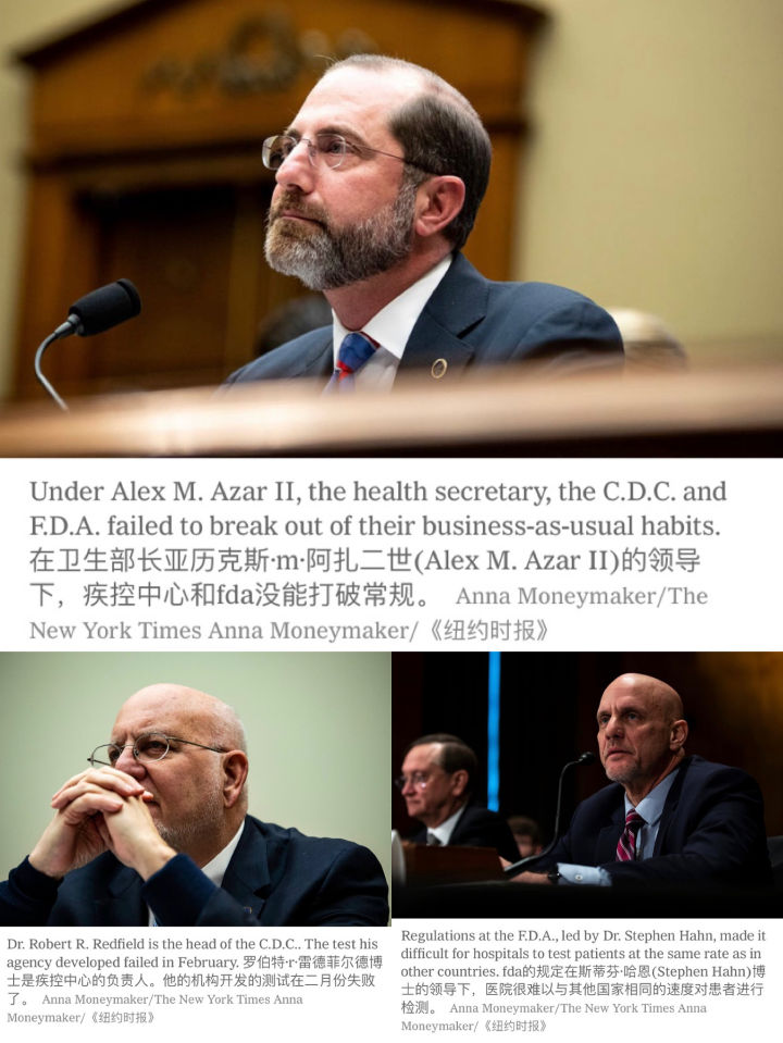 28 号纽约时报发文控诉美国前期的防疫不利,点名了 CDC、FDA、HHS 三名老大的错误[2],面对中国发出的警告,没有一个人表达出需要毫不犹豫进行防御的紧迫性,相反,不断地在等待检测剂的研制,甚至还不断限制了检测人群,让各大医疗机构难以部署诊断测试。