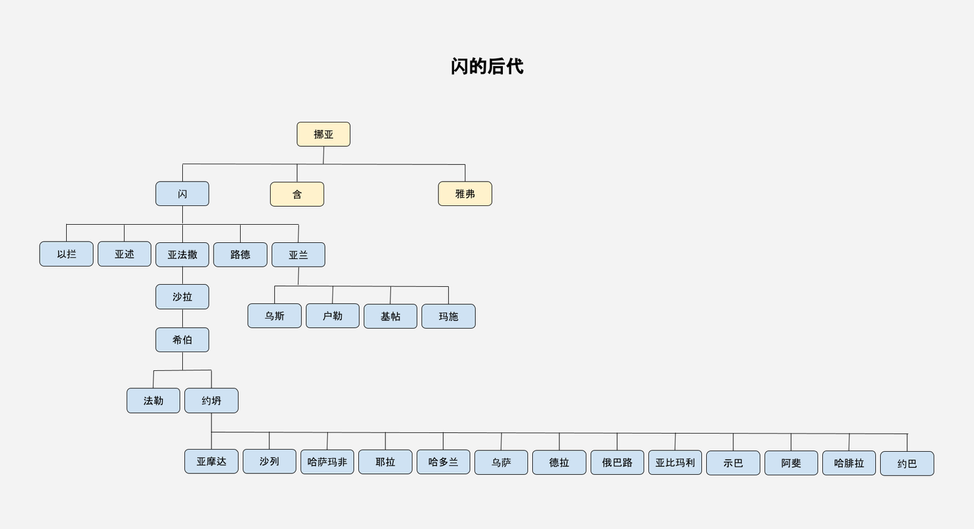 闪这一支是「正统」。上一章挪亚赐福给闪,便说了「耶和华,闪的神」。闪的四世孙叫做希伯,希伯来人就源自希伯。