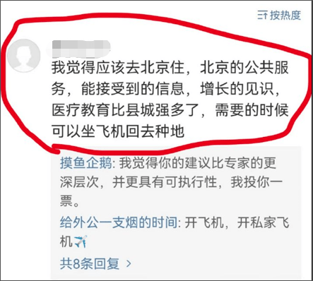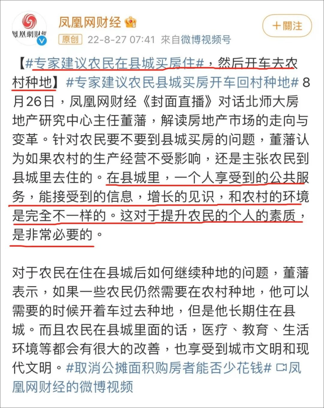 “在县城里,一个人享受到的公共服务,能接受到的信息,增长的见识,和农村的环境是完全不一样的。这对于提升农民的个人的素质,是非常必要的”。