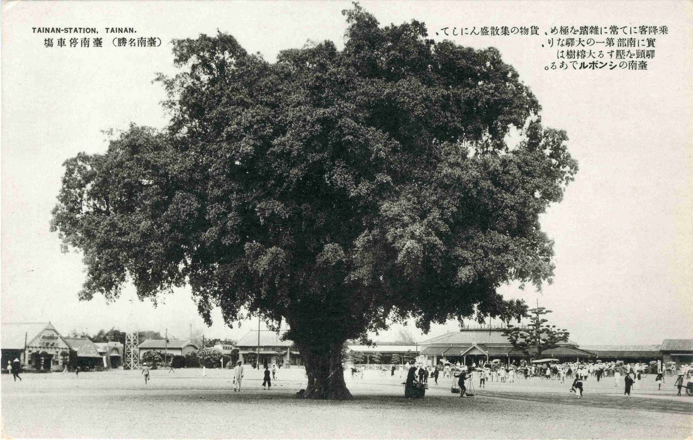 清國時代的老榕可能就已生長在這塊土地上,到了日本時代幸好受到官方的呵護,1911年臺南發布市區計畫時,特別規劃綠園空間,保有老榕的棲身之地,同年也在綠園的北側設置後籐新平男爵的銅像,與老榕在站前一南一北相對,周邊也加以綠化。廣場上的參天老榕,不只見證了1900年臺南停車場的設立,還有歷經的數次修建,再到1936年第二代站房的完工,同時是許多外地人搭乘火車抵達古都的第一印象。