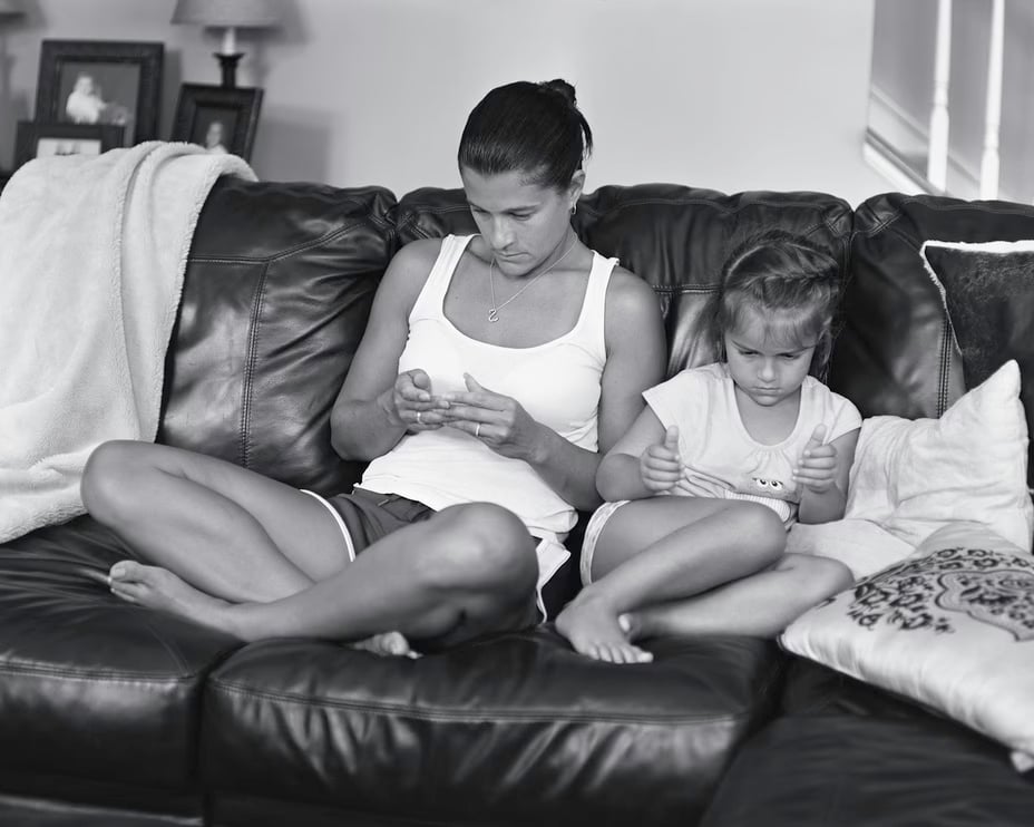 Eric Pickersgill的著名纪实摄影项目"Removed"拍摄了人们在日常生活中(聚餐、躺在床上、坐在街头)低头看手机的真实场景,但在按下快门前,他拿走了他们手中的电子设备,照片里的人保持着抓握手机的姿势,眼神空洞地盯着手里的空气
