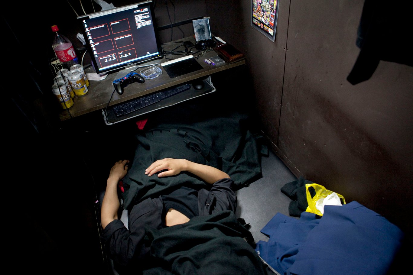 日本1989年经济泡沫破裂后,随着日本非正式雇佣比例的增加和社会保障的减弱,大量从事临时派遣工作、无法承担高昂租金的年轻人和中年人,被迫长期居住在收费低廉的24小时网吧中,他们被称为“网吧难民”(图源:Panos Pictures)