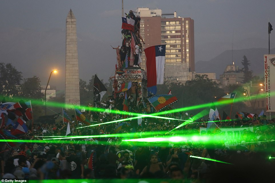 智利曾被视为芝加哥学派新自由主义的最完美实验场(一切皆可私有化)。2019年,仅仅因为地铁票价上涨了30比索,引发了全国性的反新自由主义大起义。他们的核心口号是:“不是因为30比索,而是因为30年”。图为抗议者用激光来试图击落防暴警察的无人机。(图源:Getty)