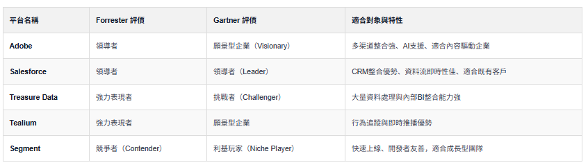 若企業需要在B2C場景中推動個人化與全渠道整合,Forrester推薦 Adobe 與 Salesforce 為成熟的首選平台。
