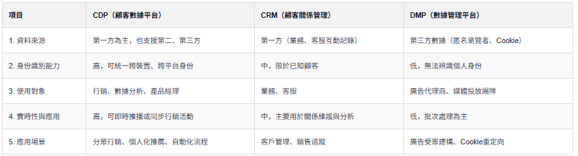 2.2 CDP、CRM、DMP 的差異比較: