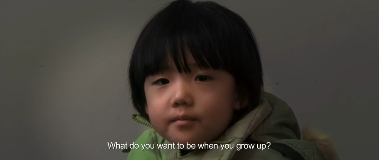 在一间极简的、毫无装饰的,四周几乎只有白墙的房间里,小女孩若有所思地盯着小男孩看,小男孩则投以呆滞却不失纯真的目光,似乎是某种回应,似乎又不是。小女孩率先打断沉默,问道:“你长大了想做什么?”小男孩沉默了一会儿,随后回答道:“孤儿。”小女孩又评价道:“你真是一个可怜的孩子。”