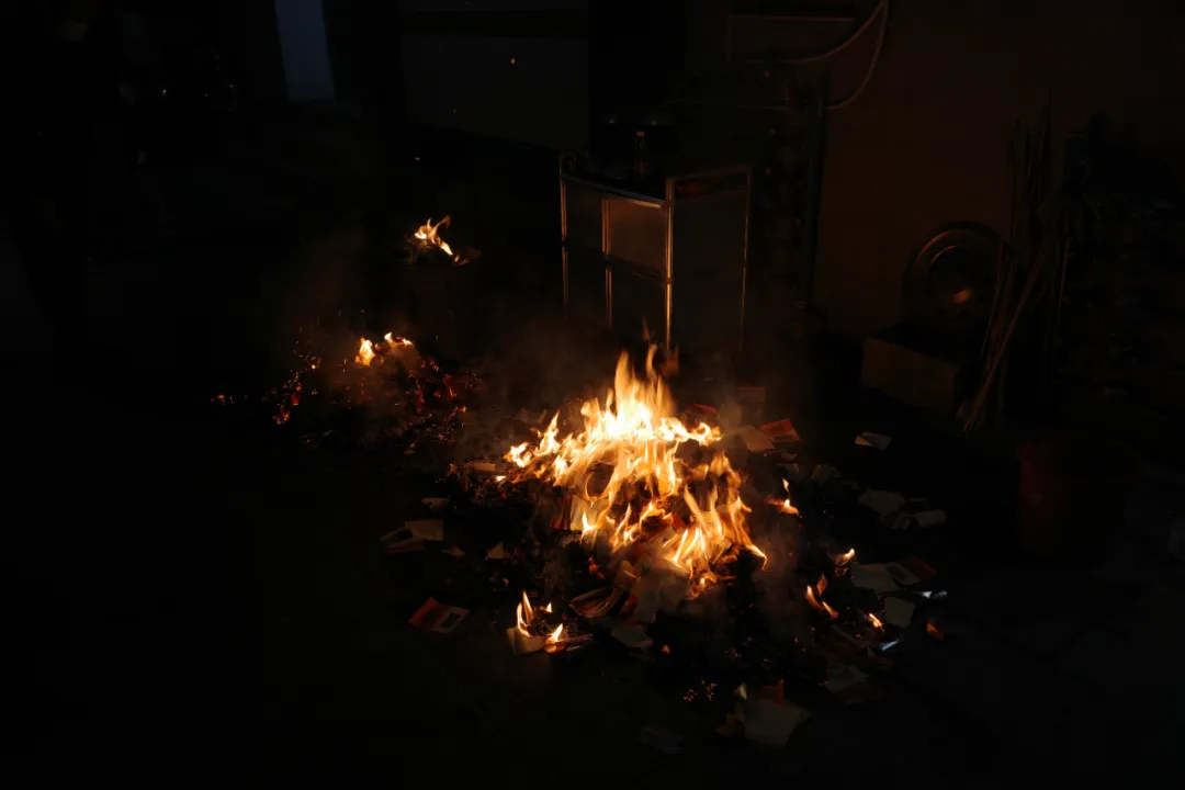 往佛像这边下跪,再往外嬷那边下跪。大舅二舅跪得最多。我则在门边的位置,趁着人与人之间的缝隙,看着他们不断下跪,偶尔我也得跪一下。中间我们在刘察巷烧了一波纸钱,又接着第二波仪式。瘦高男孩换了一身黄色经袍,摇身一变为唐僧,接替他父来主持,在刘察巷上演《西游记》。