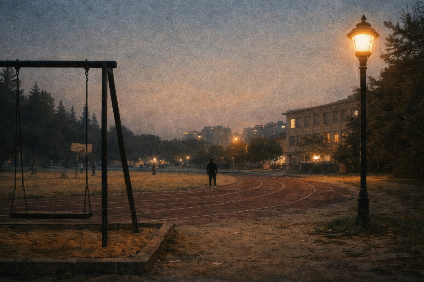 后来很多年,我都没有再回那个操场。校园合并之后改造成了养老院,杨树可能被砍掉了,沙坑也许被填平,单杠换成了新的器械,那条被我当成滑梯的无障碍斜坡也许早就铺上了新的水泥。如果我真的再回去,大概什么都认不出来。但在记忆里,它们一直停在那个傍晚。操场很空,晚风从跑道上慢慢吹过去,天空一点点暗下来,教学楼的窗户一盏一盏亮起灯,远处不知道是谁还在打篮球,空气里是夏日傍晚被晒得发热的水泥地特有的气味,球砸在地上的声音一下一下回响。我骑着那辆绿色的自行车,一圈一圈往前走,车把还有点晃,脚蹬得很慢,心跳得很快。那时候我还不知道,以后会离开那所学校,离开那个宿舍区,离开那些杨树、沙坑、灌木丛和藏宝地图,也不知道有一天,那个曾经在身后扶着车的人背影会慢慢弯下去,那个骑着车接我回家的黑发女士也会满头银发,那个把我抱在前杠小窝里的手臂终有一天会从这个世界上消失。时间会一点一点带走人,也带走场景。可奇怪的是,那些陪伴却没有真正离开,它们好像变成了一股很平静的力量,留在身体里。就像当年学骑车的时候,车子摇摇晃晃,我总觉得自己会摔倒,可只要想到有人曾经在后面扶过,有人曾经在前面等着,有人曾经把我稳稳圈在怀里,就好像没有那么害怕了。风还是一直往前吹,那辆自行车也一直往前走。