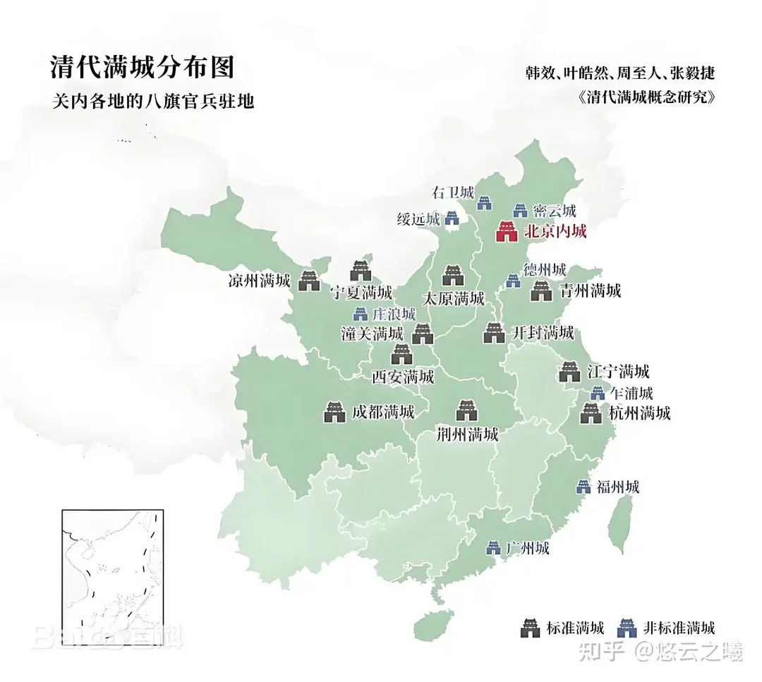 除了上述规模巨大,功能完整的满城,另外还有约75处小型驻防点(不同学者统计口径不一,在此取中间值)